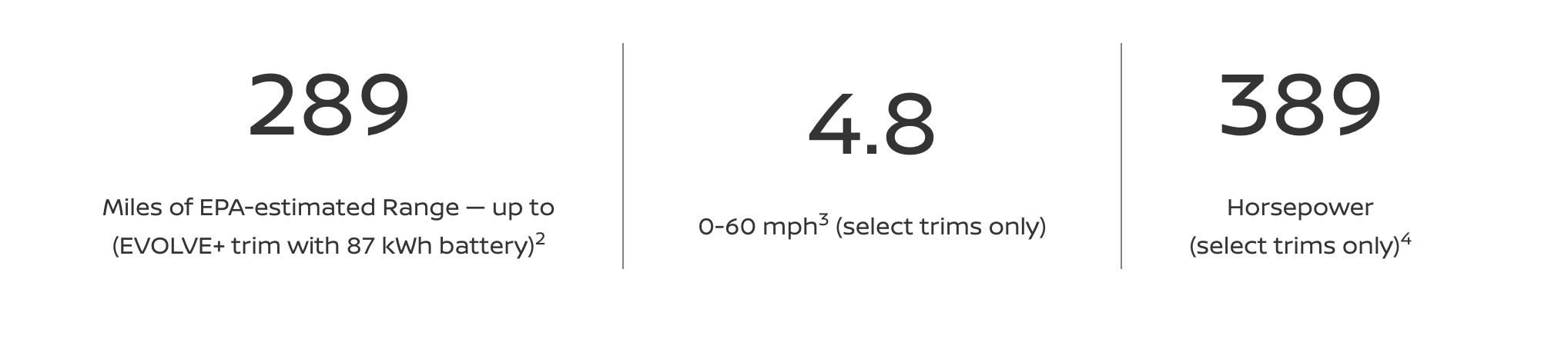 2 Targeted 2025 MY EPA-estimated range up to 289 miles for combined city/highway driving for EVOLVE+ FWD. Targeted 2025 MY EPA-estimated range up to 216 miles for combined city/highway driving for ENGAGE FWD. Targeted 2025 MY EPA-estimated range up to 205 miles for combined city/highway driving for ENGAGE Dual Motor e-4ORCE AWD. Targeted 2025 MY EPA-estimated range up to 272 miles for ENGAGE+ Dual Motor e-4ORCE AWD and EVOLVE+ Dual Motor e-4ORCE AWD. Targeted 2025 MY EPA-estimated range up to 267 miles for PLATINUM+ Dual Motor e-4ORCE AWD and 257 miles for PLATINUM+ Dual Motor e-4ORCE AWD with optional 20" wheels. Targeted 2025 EPA Fuel Economy Estimates equivalent to 105 City, 91 Highway for EVOLVE+ FWD. Based on EPA formula of 33.7 kW/hour equal to one gallon of gasoline energy, and on Nissan internal testing results, subject to EPA confirmation. EPA data not available at time of publication. Targeted estimates for EVOLVE+ FWD are equivalent to 105 MPG measured as gasoline fuel efficiency in city driving, and 91 MPG in highway driving. Targeted 2025 EPA Fuel Economy Estimates equivalent to 109 City, 94 Highway for ENGAGE FWD. Based on EPA formula of 33.7 kW/hour equal to one gallon of gasoline energy, and on Nissan internal testing results, subject to EPA confirmation. EPA data not available at time of publication. Targeted estimates for ENGAGE FWD are equivalent to 109 MPG measured as gasoline fuel efficiency in city driving, and 94 MPG in highway driving. Targeted 2025 EPA Fuel Economy Estimates equivalent to 101 City, 89 Highway for ENGAGE Dual Motor e-4ORCE AWD. Based on EPA formula of 33.7 kW/hour equal to one gallon of gasoline energy, and on Nissan internal testing results, subject to EPA confirmation. EPA data not available at time of publication. Targeted estimates for ENGAGE Dual Motor e-4ORCE AWD are equivalent to 101 MPG measured as gasoline fuel efficiency in city driving, and 89 MPG in highway driving. Targeted 2025 EPA Fuel Economy Estimates equivalent to 97 City, 86 Highway for ENGAGE+ Dual Motor e-4ORCE AWD and EVOLVE+ Dual Motor e-4ORCE AWD. Based on EPA formula of 33.7 kW/hour equal to one gallon of gasoline energy, and on Nissan internal testing results, subject to EPA confirmation. EPA data not available at time of publication. Targeted estimates for ENGAGE+ Dual Motor e-4ORCE AWD and EVOLVE+ Dual Motor e-4ORCE AWD are equivalent to 97 MPG measured as gasoline fuel efficiency in city driving, and 86 MPG in highway driving. Targeted 2025 EPA Fuel Economy Estimates equivalent to 93 City, 87 Highway for PLATINUM+ Dual Motor e-4ORCE AWD. Based on EPA formula of 33.7 kW/hour equal to one gallon of gasoline energy, and on Nissan internal testing results, subject to EPA confirmation. EPA data not available at time of publication. Targeted estimates for PLATINUM+ Dual Motor e-4ORCE AWD are equivalent to 93 MPG measured as gasoline fuel efficiency in city driving, and 87 MPG in highway driving. Targeted 2025 EPA Fuel Economy Estimates equivalent to 89 City, 84 Highway for PLATINUM+ Dual Motor e-4ORCE AWD with optional 20" wheels. Based on EPA formula of 33.7 kW/hour equal to one gallon of gasoline energy, and on Nissan internal testing results, subject to EPA confirmation. EPA data not available at time of publication. Targeted estimates for PLATINUM+ Dual Motor e-4ORCE AWD with optional 20" wheels are equivalent to 89 MPG measured as gasoline fuel efficiency in city driving, and 84 MPG in highway driving. Actual mileage will vary with trim levels, options, and driving conditions. See Customer Disclosure Form for details. Use for comparison only.
